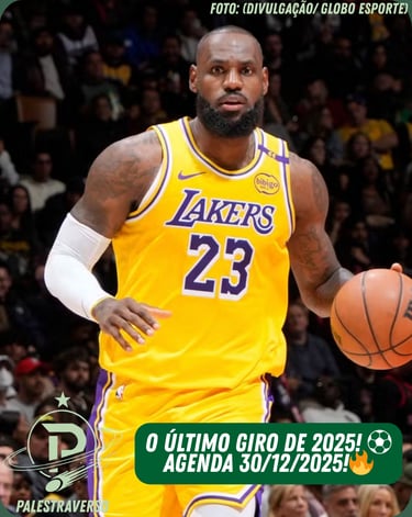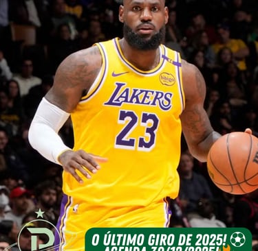 A transição para o dia 31 de dezembro será histórica. Exatamente às 00h30, o Los Angeles Lakers recebe o Detroit Pistons. A partida ganha contornos especiais por celebrar os 41 anos de LeBron James. O "Rei" entra em quadra no dia de seu aniversário buscando manter os Lakers na zona de classificação direta para os Playoffs.