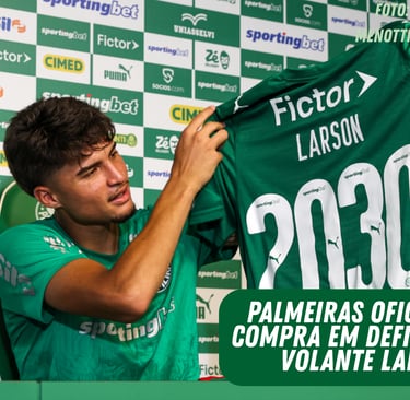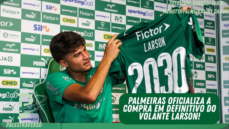 O Palmeiras deu mais um passo importante na manutenção de seus talentos e no planejamento a longo prazo. Na manhã desta terça-feira (27), o clube oficializou a compra em definitivo do volante Larson, de 20 anos. O atleta, que pertencia ao Goiás e estava emprestado ao Verdão, assinou um novo vínculo válido por cinco temporadas, estendendo sua permanência na Academia de Futebol até dezembro de 2030.
